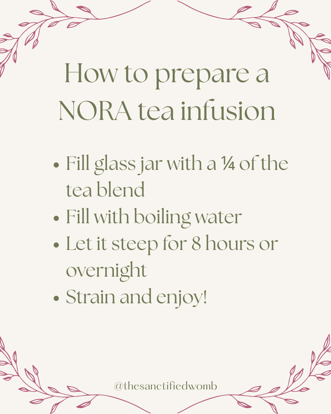 So, now you may be asking yourself, how do I prepare NORA tea? NORA tea is best consumed as an herbal infusion. Rather than simply steeping the tea for 3-6 minutes, which only gets the aromatic benefits of the tea, we want to pull all those lovely nutrients out and use them. Herbal infusions extract the full mineral benefits from the herbs and give your body the best chance at absorbing the nutrients.